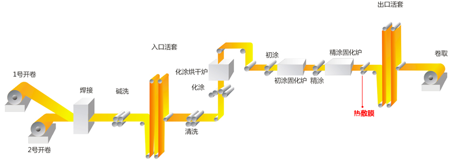 热覆膜板是指在钢板表面复合PET+PVC或PVC或单层PET 等复合膜的彩色层压钢板。热覆膜板具备了金属材料良好的强度及加工性能,同时也具备了高分子薄膜优异的装饰性能、耐腐蚀性能、耐候性能、耐污染性能等。